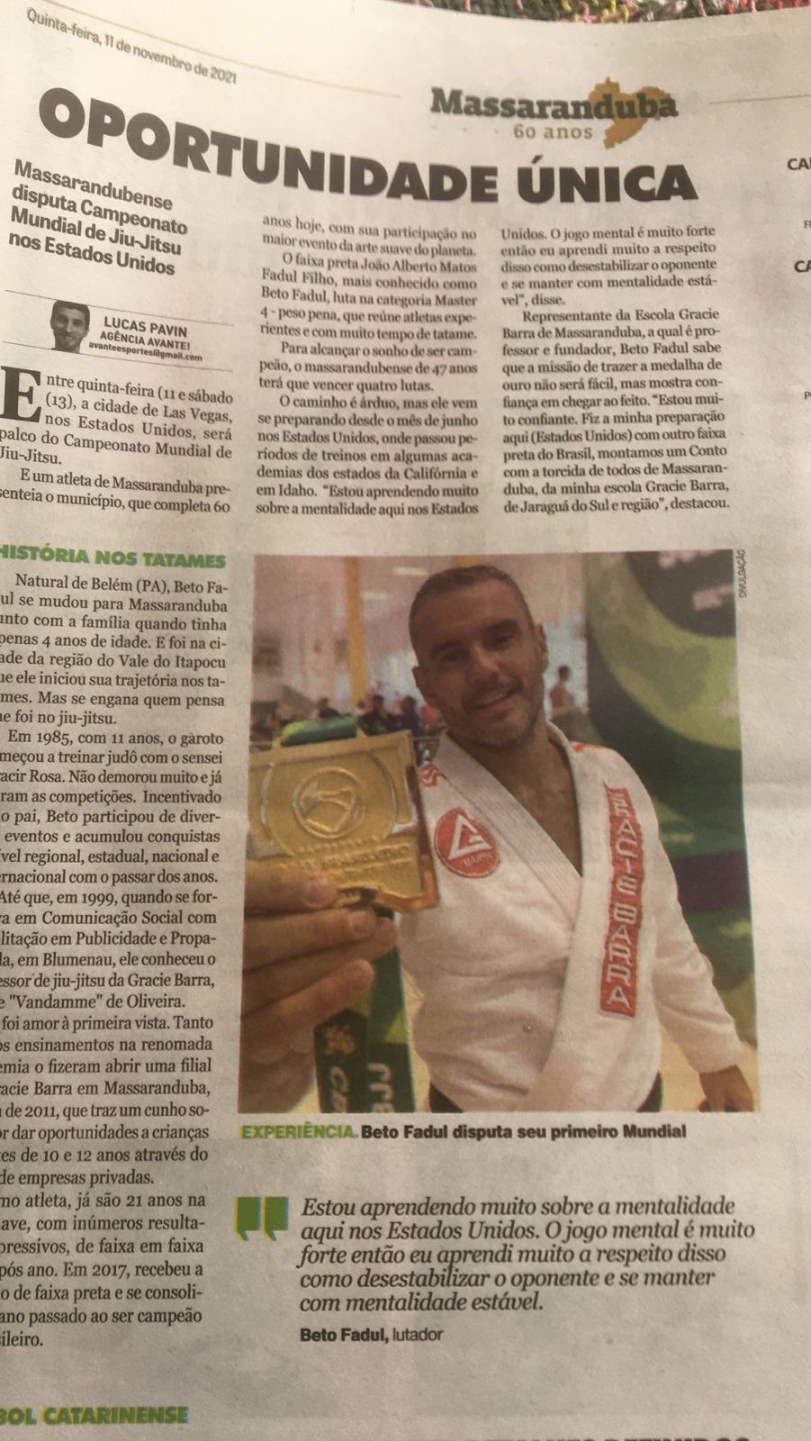 Matéria publicada no website www.avnteesportes.com e na mídia impressa OCP, jornal O Correio do Povo, em 11 de novembro de 2021, antes da participação do atleta Beto Fadul ( Joao Alberto Matos Fadul Filho ) no Campeonato Mundial de Jiu-Jitsu Master em Las Vegas.